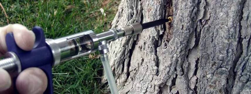 Dependiendo del perímetro del árbol, se hacen una serie de taladros, aproximadamente uno cada 30 centímetros. A continuación se introduce una cánula en ese taladro y a través de esa cánula introducimos el producto fitosanitario en el sistema vascular del árbol. Este proceso no daña el árbol, ya que en poco tiempo logra compartimentar el agujero.